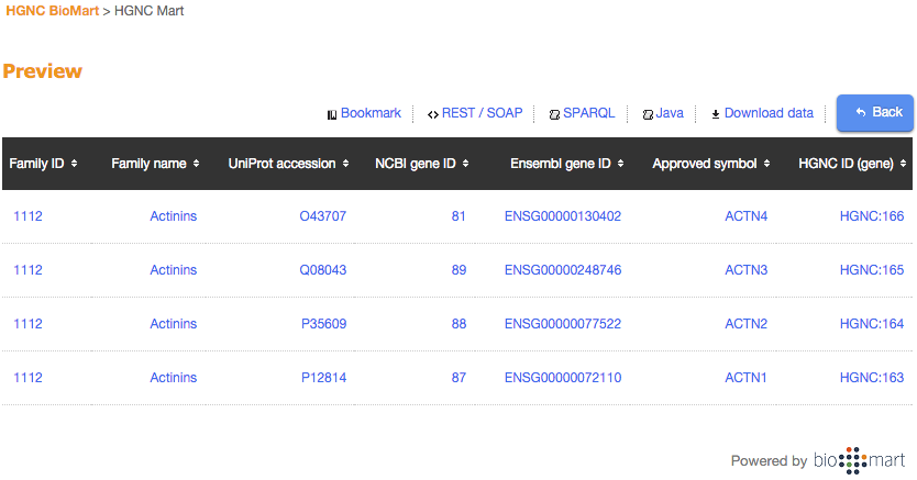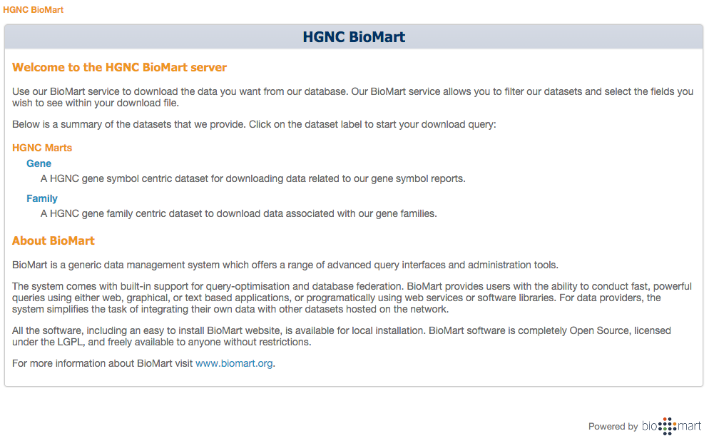 The BioMart home page offers the user a choice to search and download gene or family centric data.