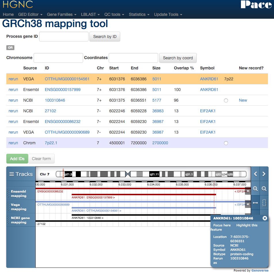 The previous xref updater tools reports mismatches between our resource and the others. This new mapping tool edits the cross references per gene, and provides ensembl like tracks to compare NCBI gene, Ensembl and Vega on the GRCh38 build.