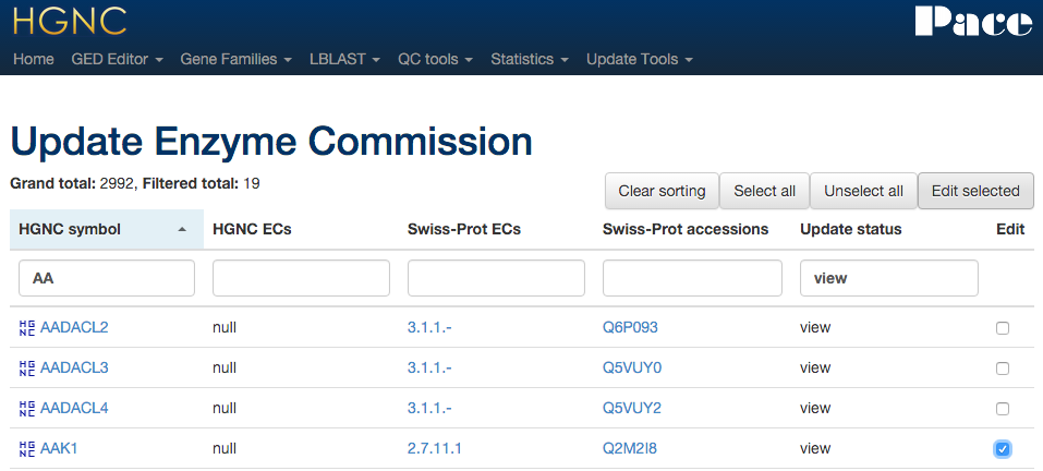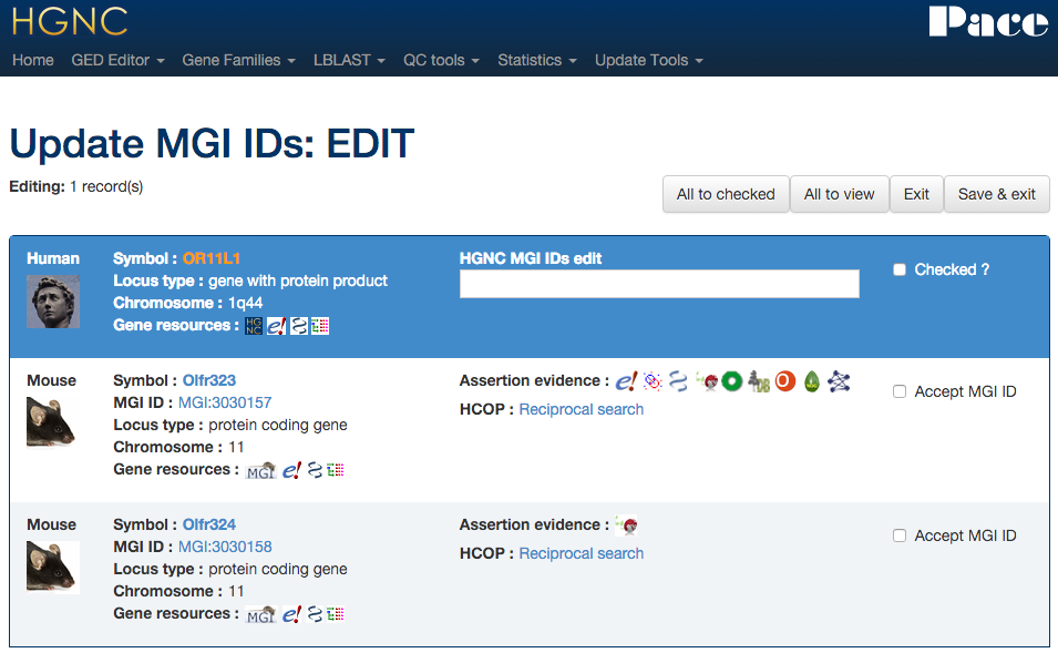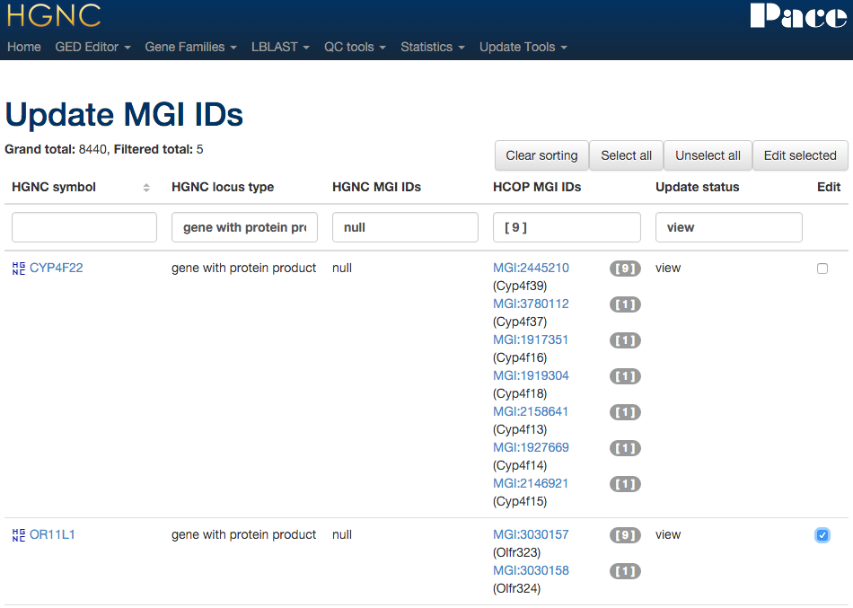 ... will take the curator to a form resembling a HCOP results page where the curator can select the MGI ID(s) to link to the HGNC gene record. Like the EC updater, multiple genes can be edited at once in one form.