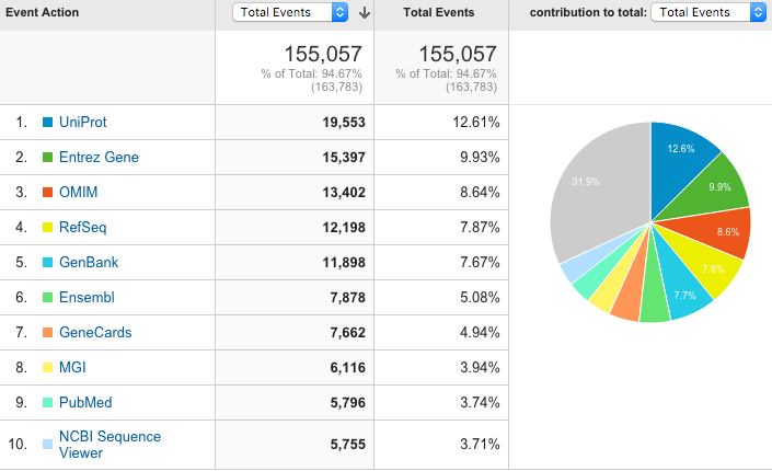 The table is similar to last year with the UniProt links being the most popular. Ensembl links have become more popular compared to last year, rising from 8th to 6th in the table.